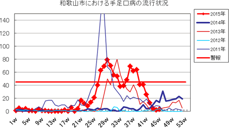 2015年1週1件、2週5件、3週2件、4週4件、5・6週1件、7週3件、9・10週1件、11・12・13・14・15週0件、16週2件、17週0件、18週6件、19週0、20週4件、21週17件、22週12件、23週8件、24週14件、25週21件、26週40件、27週63件、28週69件で、29週79件、30週70件、31週56件、32週54件、33週38件、34週39件、35週48件、36週69件、37週62件、38週64件、39・40週41件、41週26件でしたが、42週13件(定点あたり1.44)となり、警報は解除されました。43週5件、44週2件、45週3件(定点あたり0.33)でした。年齢別では6歳以下の小児がほぼ100%を占めています