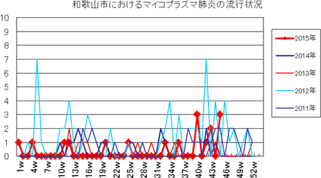 和歌山市の患者報告数は、2015年第1週1件、4週1件、11・12週1件、20週1件、25週1件、33週1件、40週3件、42週1件、43週2件、45週3件の報告がありました。