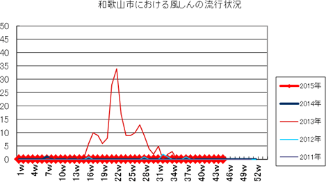 2015年1・2週4件、3・4週3件、5週4件、6週1件、7週2件、8週5件、9週0件、10週6件、11週9件、12週3件、13週5件、14週3件、15週7件、16週5件、17週8件、18週2件、19週5件、20週3件、21週1件、22週2件、23週6件、24週2件、25・26週3件、27週5件、28週2件、29週3件、30週4件、31・32・33週3件、34・35週1件、36週0件、37週1件、38週1件、39週2件、42週3件、43週0件、44週3件、45週0件(定点あたり0.00)でした。