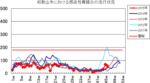 2015年1週26件、2週52件、3週74件、4週70件、5週68件、6週48件、7週49件、8週64件、9週57件、10週58件、11週81件、12週69件、13週47件、14週36件、15週47件、16週43件、17週60件、18週66件、19週21件、20週60件、21週72件、22週64件、23週55件、24週70件、25・26週67件、27週61件、28週42件、29週40件、30週22件、31週40件で、32週31件、33週21件、34週25件、35週21件、36週22件、37週21件、38週29件、39週10件、40週15件で、41週21件、42週20件、43週22件、44週32件、45週69件、46週58件(定点あたり6.44)でした。