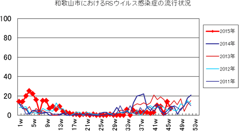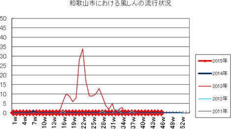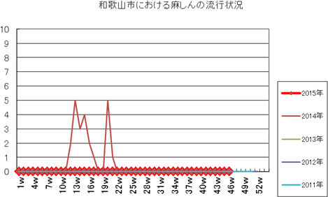 和歌山市の患者報告数は、2015年第1週1件、4週1件、11・12週1件、20週1件、25週1件、33週1件、40週3件、42週1件、43週2件、45・46週3件の報告がありました。