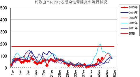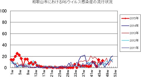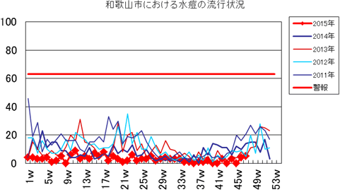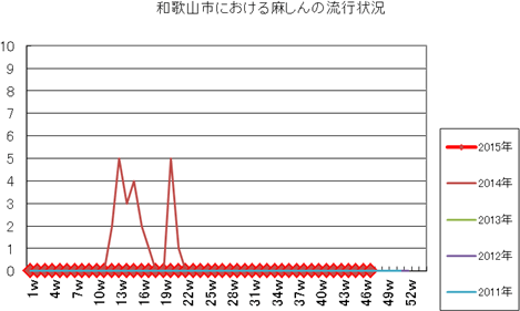 和歌山市の患者報告数は、2015年第1週1件、4週1件、11・12週1件、20週1件、25週1件、33週1件、40週3件、42週1件、43週2件、45・46週3件、47週1件の報告がありました。