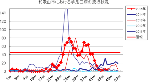2015年1週26件、2週52件、3週74件、4週70件、5週68件、6週48件、7週49件、8週64件、9週57件、10週58件、11週81件、12週69件、13週47件、14週36件、15週47件、16週43件、17週60件、18週66件、19週21件、20週60件、21週72件、22週64件、23週55件、24週70件、25・26週67件、27週61件、28週42件、29週40件、30週22件、31週40件で、32週31件、33週21件、34週25件、35週21件、36週22件、37週21件、38週29件、39週10件、40週15件で、41週21件、42週20件、43週22件、44週32件、45週69件、46週58件、47週82件(定点あたり9.11)でした。
