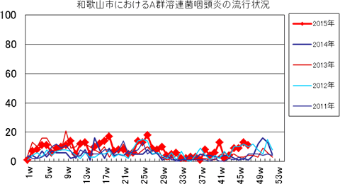2015年1・2週4件、3・4週3件、5週4件、6週1件、7週2件、8週5件、9週0件、10週6件、11週9件、12週3件、13週5件、14週3件、15週7件、16週5件、17週8件、18週2件、19週5件、20週3件、21週1件、22週2件、23週6件、24週2件、25・26週3件、27週5件、28週2件、29週3件、30週4件、31・32・33週3件、34・35週1件、36週0件、37週1件、38週1件、39週2件、42週3件、43週0件、44週3件、45週0件、46週4件、47週5件(定点あたり0.56)でした。