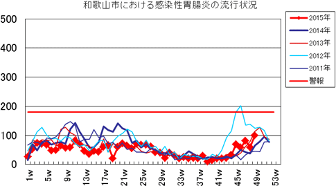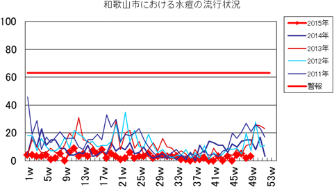 2015年1週26件、2週52件、3週74件、4週70件、5週68件、6週48件、7週49件、8週64件、9週57件、10週58件、11週81件、12週69件、13週47件、14週36件、15週47件、16週43件、17週60件、18週66件、19週21件、20週60件、21週72件、22週64件、23週55件、24週70件、25・26週67件、27週61件、28週42件、29週40件、30週22件、31週40件で、32週31件、33週21件、34週25件、35週21件、36週22件、37週21件、38週29件、39週10件、40週15件で、41週21件、42週20件、43週22件、44週32件、45週69件、46週58件、47週82件、48週59件、49週(定点あたり11.1)でした。