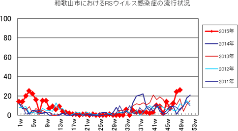 2015年第41週3件、42週10件、43週9件、44週2件、45週14件、46週7件、47週12件、48週24件、49週26件(定点あたり2.89)でした。年齢別では2歳以下の小児が80%以上を占めています。