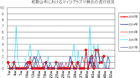 和歌山市の患者報告数は、2015年第1週1件、4週1件、11・12週1件、20週1件、25週1件、33週1件、40週3件、42週1件、43週2件、45・46週3件、47・48週1件、49週2件の報告がありました。