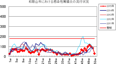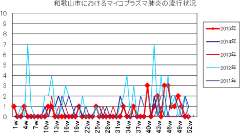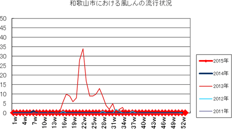 2015年1・2週4件、3・4週3件、5週4件、6週1件、7週2件、8週5件、9週0件、10週6件、11週9件、12週3件、13週5件、14週3件、15週7件、16週5件、17週8件、18週2件、19週5件、20週3件、21週1件、22週2件、23週6件、24週2件、25・26週3件、27週5件、28週2件、29週3件、30週4件、31・32・33週3件、34・35週1件、36週0件、37週1件、38週1件、39週2件、42週3件、43週0件、44週3件、45週0件、46週4件、47週5件、48週2件、49週3件、50週2件、51週10件、52週3件、53週0件(定点あたり0.00)でした。