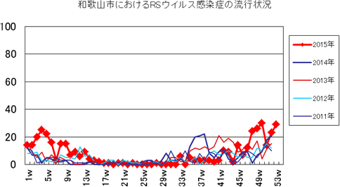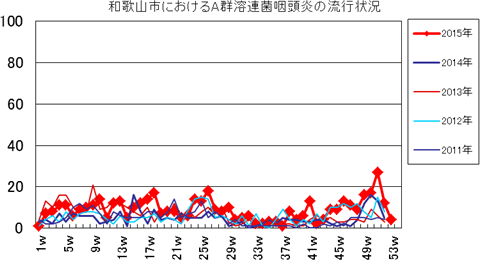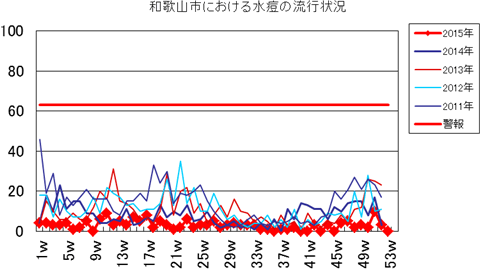 2015年1週26件、2週52件、3週74件、4週70件、5週68件、6週48件、7週49件、8週64件、9週57件、10週58件、11週81件、12週69件、13週47件、14週36件、15週47件、16週43件、17週60件、18週66件、19週21件、20週60件、21週72件、22週64件、23週55件、24週70件、25・26週67件、27週61件、28週42件、29週40件、30週22件、31週40件で、32週31件、33週21件、34週25件、35週21件、36週22件、37週21件、38週29件、39週10件、40週15件で、41週21件、42週20件、43週22件、44週32件、45週69件、46週58件、47週82件、48週59件、49週100件、50週116件、51週99件、52週85件、53週30件(定点あたり3.33)でした。