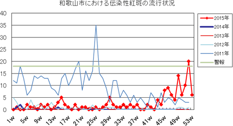 2015年50週6件、51週10件、52週20件(定点あたり2.22)と警報レベルを超えました。53週は6件でした。