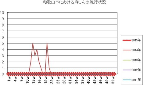 和歌山市の患者報告数は、2015年第1週1件、4週1件、11・12週1件、20週1件、25週1件、33週1件、40週3件、42週1件、43週2件、45・46週3件、47・48週1件、49週2件、50週1件、53週3件の報告がありました。