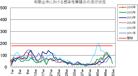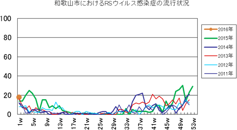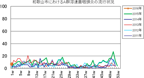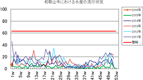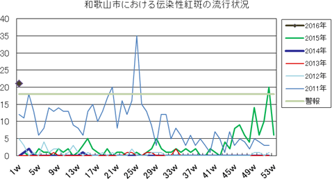 和歌山市の患者報告数は、2015年第1週1件、4週1件、11・12週1件、20週1件、25週1件、33週1件、40週3件、42週1件、43週2件、45・46週3件、47・48週1件、49週2件、50週1件、53週3件で、2016年第1週3件の報告がありました。