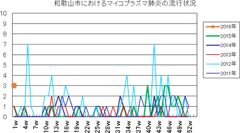 2015年46週4件、47週5件、48週2件、49週3件、50週2件、51週10件、52週3件、53週0件で、2016年第1週7件(定点あたり0.78)でした。