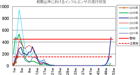 和歌山市内におけるインフルエンザの報告数は、2015年シーズンは、第46週0件、第47週5件、第48週6件、第49週5件、第50週3件、第51週2件、第52週4件、第53週1件で、2016年1週26件(定点あたり1.73)と定点あたり1.00をこえ、2週60件、3週154件(定点あたり10.3)となり、注意報基準を超えました。