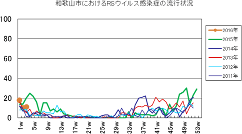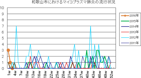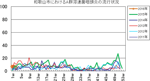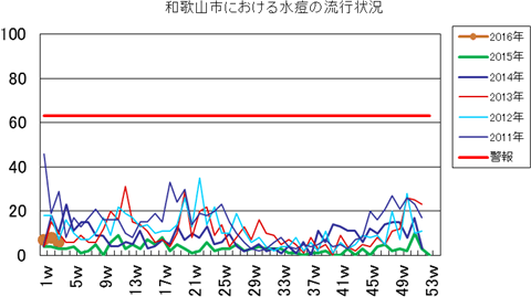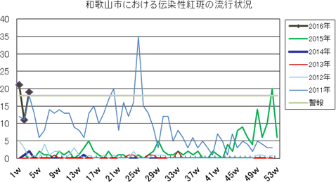和歌山市の患者報告数は、2015年第1週1件、4週1件、11・12週1件、20週1件、25週1件、33週1件、40週3件、42週1件、43週2件、45・46週3件、47・48週1件、49週2件、50週1件、53週3件で、2016年第1週3件、2週1件の報告がありました。