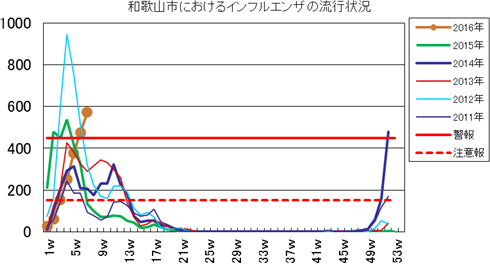 和歌山市内におけるインフルエンザの報告数は、2015年シーズンは、第46週0件、第47週5件、第48週6件、第49週5件、第50週3件、第51週2件、第52週4件、第53週1件で、2016年1週26件(定点あたり1.73)と定点あたり1.00をこえ、2週60件、3週154件(定点あたり10.3)、4週250件、5週378件、6週476件(定点あたり31.7)となり警報レベルを超えました。7週572件(定点あたり38.1)です。全国的には、第7週定点あたり37.16人でした。発生状況の詳細はこちらへ。