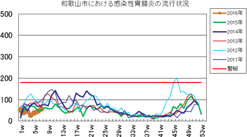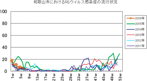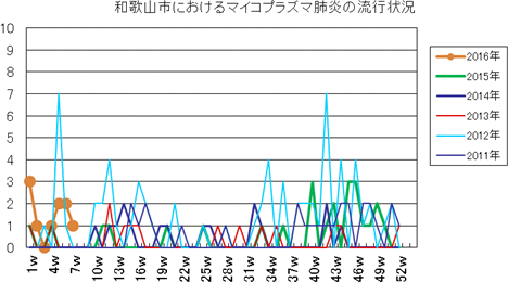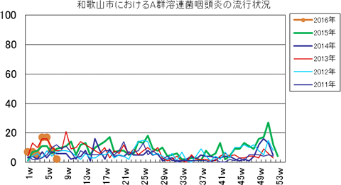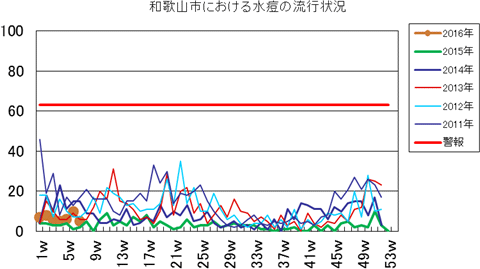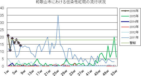 和歌山市の患者報告数は、2015年第1週1件、4週1件、11・12週1件、20週1件、25週1件、33週1件、40週3件、42週1件、43週2件、45・46週3件、47・48週1件、49週2件、50週1件、53週3件で、2016年第1週3件、2週1件、4週1件、5・6週2件、7週1件の報告がありました。