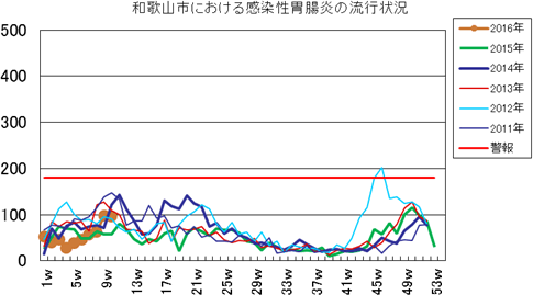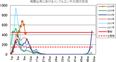 和歌山市内におけるインフルエンザの報告数は、2015年シーズンは、第46週0件、第47週5件、第48週6件、第49週5件、第50週3件、第51週2件、第52週4件、第53週1件で、2016年1週26件(定点あたり1.73)と定点あたり1.00をこえ、2週60件、3週154件(定点あたり10.3)、4週250件、5週378件、6週476件(定点あたり31.7)となり警報レベルを超えました。7週572件、8週671件、9週608件(定点あたり40.5)でしたが、10週433件(定点あたり28.9)となり警報レベル基準値を下回りました。全国的にも、第10週定点あたり28.20人で減少しました。発生状況の詳細はこちらへ。