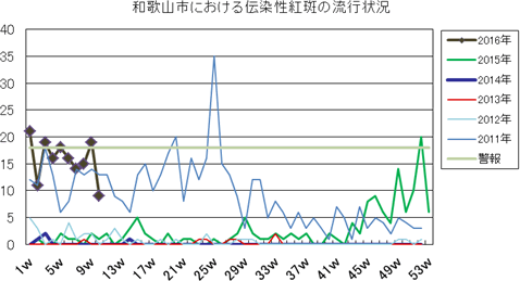 和歌山市の患者報告数は、2015年第1週1件、4週1件、11・12週1件、20週1件、25週1件、33週1件、40週3件、42週1件、43週2件、45・46週3件、47・48週1件、49週2件、50週1件、53週3件で、2016年第1週3件、2週1件、4週1件、5・6週2件、7週1件、8週2件の報告がありました。