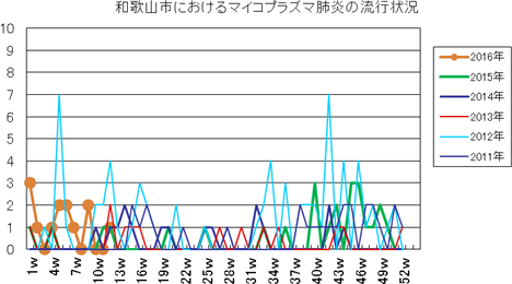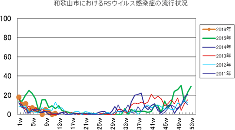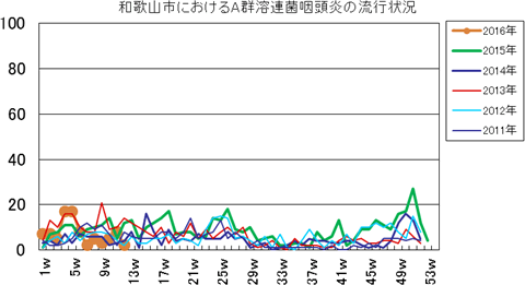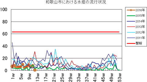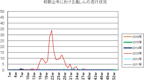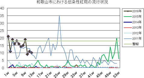 和歌山市の患者報告数は、2015年第1週1件、4週1件、11・12週1件、20週1件、25週1件、33週1件、40週3件、42週1件、43週2件、45・46週3件、47・48週1件、49週2件、50週1件、53週3件で、2016年第1週3件、2週1件、4週1件、5・6週2件、7週1件、8週2件、12週1件の報告がありました。