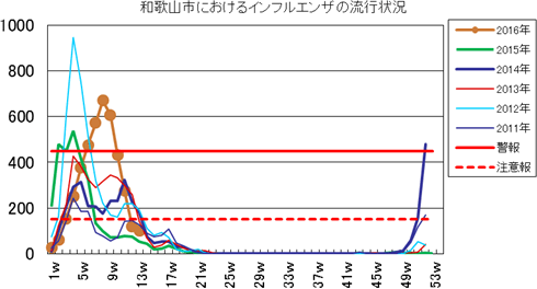 和歌山市内におけるインフルエンザの報告数は、2015年シーズンは、第46週0件、第47週5件、第48週6件、第49週5件、第50週3件、第51週2件、第52週4件、第53週1件で、2016年1週26件(定点あたり1.73)と定点あたり1.00をこえ、2週60件、3週154件(定点あたり10.3)、4週250件、5週378件、6週476件(定点あたり31.7)となり警報レベルを超えました。7週572件、8週671件、9週608件(定点あたり40.5)でしたが、10週433件(定点あたり28.9)となり警報レベル基準値を下回りました。11週275件、12週120件(定点あたり8.00)と警報が解除されました。13週はさらに減少し、100件(定点あたり6.67)でした。全国的にも、第13週定点あたり11.20人で減少しました。発生状況の詳細はこちらへ。