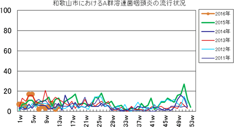 和歌山市の患者報告数は、2015年第1週1件、4週1件、11・12週1件、20週1件、25週1件、33週1件、40週3件、42週1件、43週2件、45・46週3件、47・48週1件、49週2件、50週1件、53週3件で、2016年第1週3件、2週1件、4週1件、5・6週2件、7週1件、8週2件、12・13週1件の報告がありました。