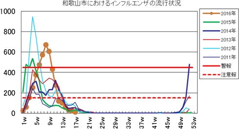 和歌山市内におけるインフルエンザの報告数は、2015年シーズンは、第46週0件、第47週5件、第48週6件、第49週5件、第50週3件、第51週2件、第52週4件、第53週1件で、2016年1週26件(定点あたり1.73)と定点あたり1.00をこえ、2週60件、3週154件(定点あたり10.3)、4週250件、5週378件、6週476件(定点あたり31.7)となり警報レベルを超えました。7週572件、8週671件、9週608件(定点あたり40.5)でしたが、10週433件(定点あたり28.9)となり警報レベル基準値を下回りました。11週275件、12週120件(定点あたり8.00)と警報が解除されました。13週はさらに減少し100件、14週58件、15週29件、16週25件、17週13件(定点あたり0.87)でした。発生状況の詳細はこちらへ。