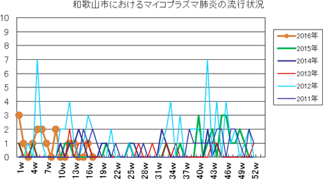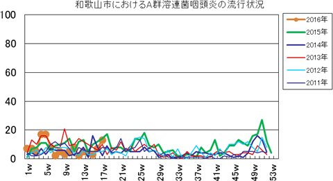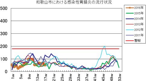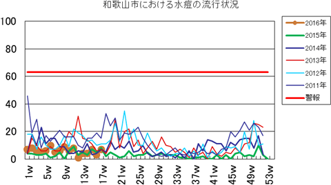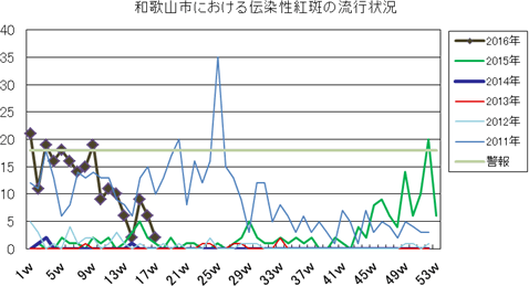 和歌山市の患者報告数は、2015年第1週1件、4週1件、11・12週1件、20週1件、25週1件、33週1件、40週3件、42週1件、43週2件、45・46週3件、47・48週1件、49週2件、50週1件、53週3件で、2016年第1週3件、2週1件、4週1件、5・6週2件、7週1件、8週2件、12・13週1件、16週1件の報告がありました。
