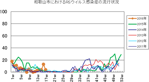 2015年第41週3件、42週10件、43週9件、44週2件、45週14件、46週7件、47週12件、48週24件、49週26件、50週30件、51週14件、52週23件53週29件で、2016年は第1週18件、2週10件、3週11件、4週4件、5週7件、6週5件、7週4件、9週5件、10週2件、11週0件、12週1件、13週3件、14・15週4件、16週13件、17週4件(定点あたり0.44)でした。年齢別では2歳以下の小児が80%以上を占めています。