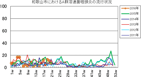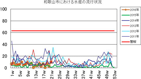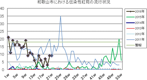 和歌山市の患者報告数は、2015年第1週1件、4週1件、11・12週1件、20週1件、25週1件、33週1件、40週3件、42週1件、43週2件、45・46週3件、47・48週1件、49週2件、50週1件、53週3件で、2016年第1週3件、2週1件、4週1件、5・6週2件、7週1件、8週2件、12・13週1件、16週1件の報告がありました。