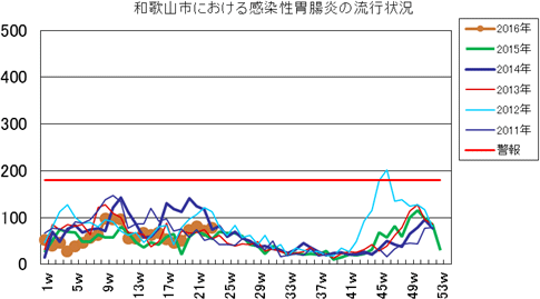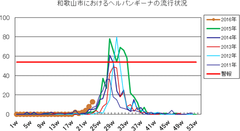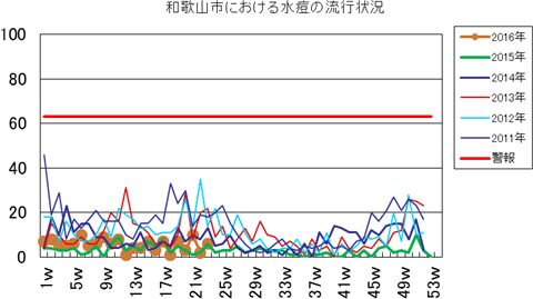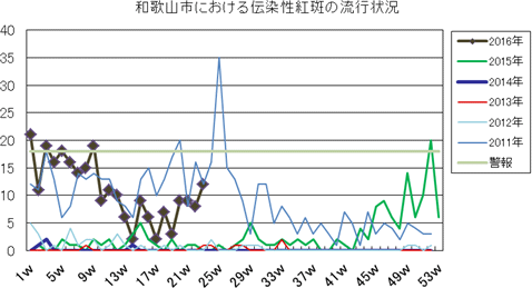 和歌山市の患者報告数は、2015年第1週1件、4週1件、11・12週1件、20週1件、25週1件、33週1件、40週3件、42週1件、43週2件、45・46週3件、47・48週1件、49週2件、50週1件、53週3件で、2016年第1週3件、2週1件、4週1件、5・6週2件、7週1件、8週2件、12・13週1件、16週1件、21・23週1件の報告がありました。