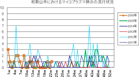 2015年46週4件、47週5件、48週2件、49週3件、50週2件、51週10件、52週3件、53週0件で、2016年第1週7件、2週8件、3週6件、4週5件、5週6件、6週10件、7週5件、8週6件、9週9件、10週6件、11週8件、12週1件、13・14週4件、15週7件、16週3件、17週7件、18週1件、19週7件、20週3件、21週10件、22週2件、23週6件(定点あたり0.67)でした。