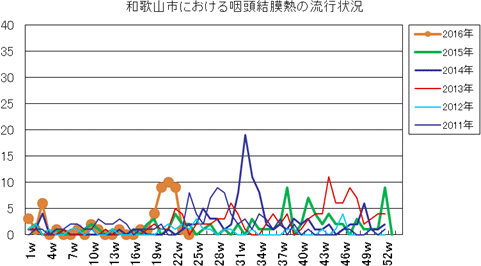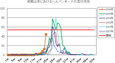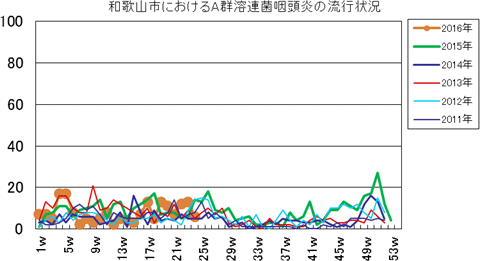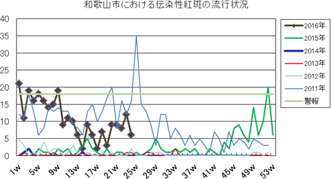 和歌山市の患者報告数は、2015年第1週1件、4週1件、11・12週1件、20週1件、25週1件、33週1件、40週3件、42週1件、43週2件、45・46週3件、47・48週1件、49週2件、50週1件、53週3件で、2016年第1週3件、2週1件、4週1件、5・6週2件、7週1件、8週2件、12・13週1件、16週1件、21・23週1件の報告がありました。