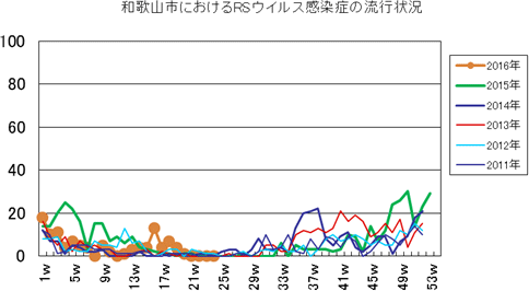2015年第41週3件、42週10件、43週9件、44週2件、45週14件、46週7件、47週12件、48週24件、49週26件、50週30件、51週14件、52週23件53週29件で、2016年は第1週18件、2週10件、3週11件、4週4件、5週7件、6週5件、7週4件、9週5件、10週2件、11週0件、12週1件、13週3件、14・15週4件、16週13件、17週4件、18週7件、19週4件、20週1件(定点あたり0.11)でした。年齢別では2歳以下の小児が80%以上を占めています。