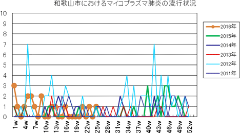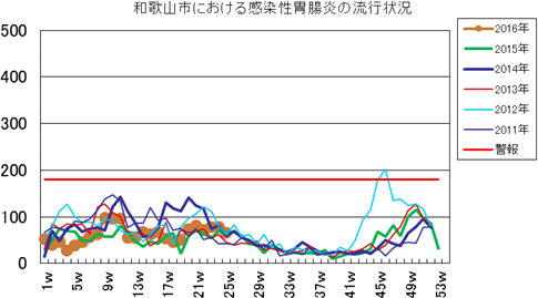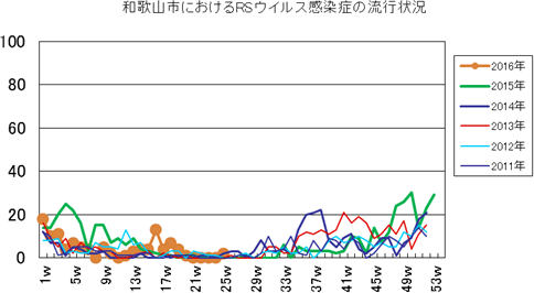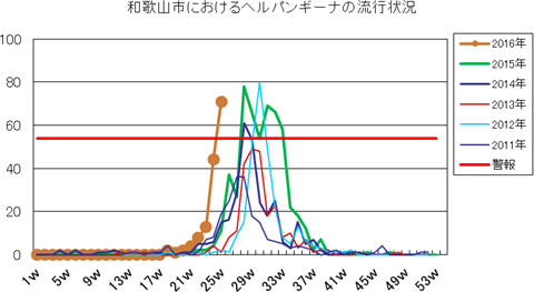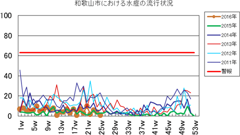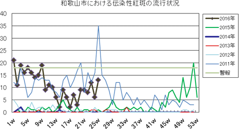 和歌山市の患者報告数は、2015年第1週1件、4週1件、11・12週1件、20週1件、25週1件、33週1件、40週3件、42週1件、43週2件、45・46週3件、47・48週1件、49週2件、50週1件、53週3件で、2016年第1週3件、2週1件、4週1件、5・6週2件、7週1件、8週2件、12・13週1件、16週1件、21・23週1件、25週1件の報告がありました。
