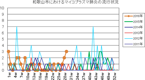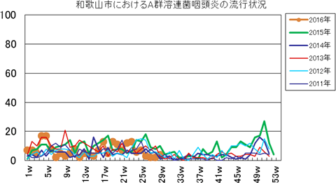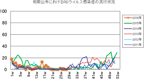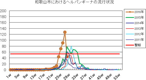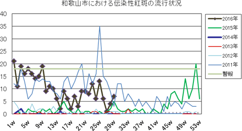 和歌山市の患者報告数は、2015年第1週1件、4週1件、11・12週1件、20週1件、25週1件、33週1件、40週3件、42週1件、43週2件、45・46週3件、47・48週1件、49週2件、50週1件、53週3件で、2016年第1週3件、2週1件、4週1件、5・6週2件、7週1件、8週2件、12・13週1件、16週1件、21・23週1件、25・27週1件、28週2件、29週3件の報告がありました。
