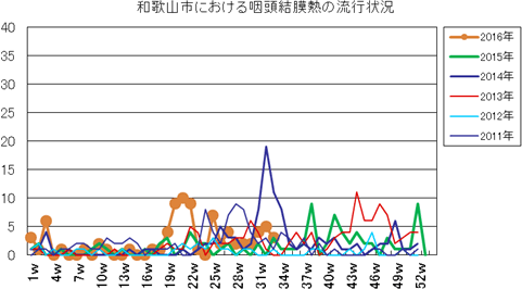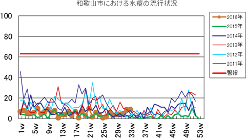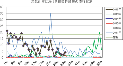 和歌山市の患者報告数は、2015年第1週1件、4週1件、11・12週1件、20週1件、25週1件、33週1件、40週3件、42週1件、43週2件、45・46週3件、47・48週1件、49週2件、50週1件、53週3件で、2016年第1週3件、2週1件、4週1件、5・6週2件、7週1件、8週2件、12・13週1件、16週1件、21・23週1件、25・27週1件、28週2件、29週3件、30週1件、32週2件、33週1件の報告がありました。