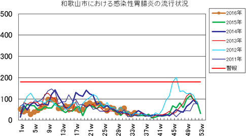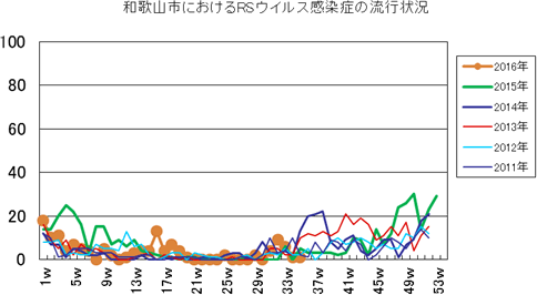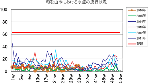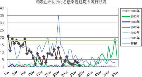 和歌山市の患者報告数は、2015年第1週1件、4週1件、11・12週1件、20週1件、25週1件、33週1件、40週3件、42週1件、43週2件、45・46週3件、47・48週1件、49週2件、50週1件、53週3件で、2016年第1週3件、2週1件、4週1件、5・6週2件、7週1件、8週2件、12・13週1件、16週1件、21・23週1件、25・27週1件、28週2件、29週3件、30週1件、32週2件、33・34週1件の報告がありました。