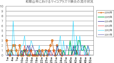 2015年46週4件、47週5件、48週2件、49週3件、50週2件、51週10件、52週3件、53週0件で、2016年第1週7件、2週8件、3週6件、4週5件、5週6件、6週10件、7週5件、8週6件、9週9件、10週6件、11週8件、12週1件、13・14週4件、15週7件、16週3件、17週7件、18週1件、19週7件、20週3件、21週10件、22週2件、23週6件、24週4件、25週1件、26週2件、27週6件、28週3件、29・30週4件、31週5件、32・33週9件、34週5件、35週5件(定点あたり0.56)でした。
