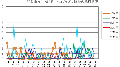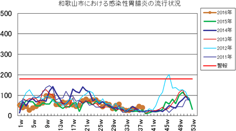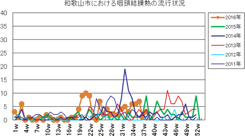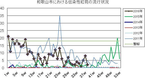 和歌山市の患者報告数は、2015年第1週1件、4週1件、11・12週1件、20週1件、25週1件、33週1件、40週3件、42週1件、43週2件、45・46週3件、47・48週1件、49週2件、50週1件、53週3件で、2016年第1週3件、2週1件、4週1件、5・6週2件、7週1件、8週2件、12・13週1件、16週1件、21・23週1件、25・27週1件、28週2件、29週3件、30週1件、32週2件、33・34週1件、36週1件の報告がありました。