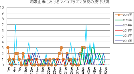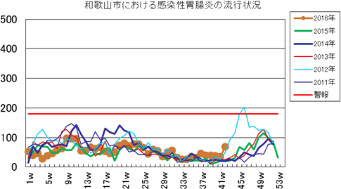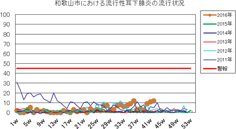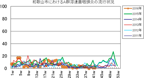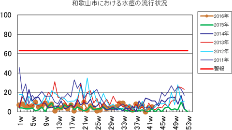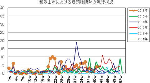 和歌山市の患者報告数は、2015年第1週1件、4週1件、11・12週1件、20週1件、25週1件、33週1件、40週3件、42週1件、43週2件、45・46週3件、47・48週1件、49週2件、50週1件、53週3件で、2016年第1週3件、2週1件、4週1件、5・6週2件、7週1件、8週2件、12・13週1件、16週1件、21・23週1件、25・27週1件、28週2件、29週3件、30週1件、32週2件、33・34週1件、36週1件、39週2件、40・41週3件、42週1件の報告がありました。