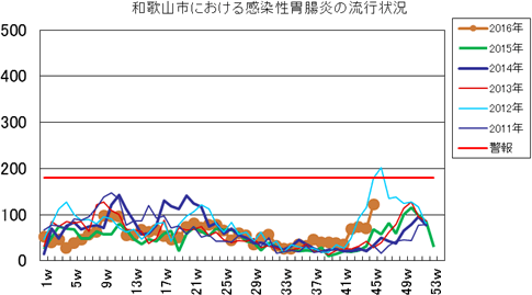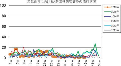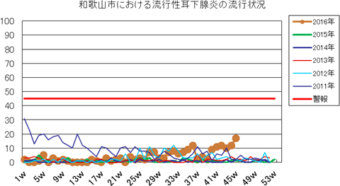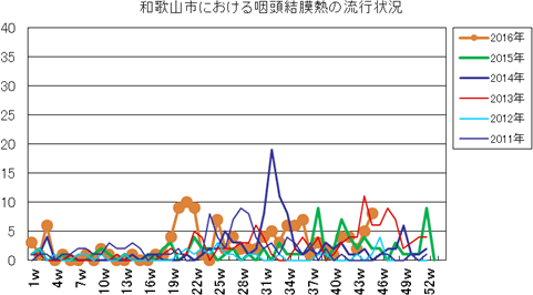 和歌山市の患者報告数は、2015年第1週1件、4週1件、11・12週1件、20週1件、25週1件、33週1件、40週3件、42週1件、43週2件、45・46週3件、47・48週1件、49週2件、50週1件、53週3件で、2016年第1週3件、2週1件、4週1件、5・6週2件、7週1件、8週2件、12・13週1件、16週1件、21・23週1件、25・27週1件、28週2件、29週3件、30週1件、32週2件、33・34週1件、36週1件、39週2件、40・41週3件、42週1件、43・45週2件の報告がありました。
