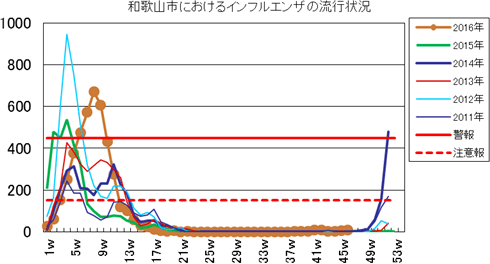和歌山市内におけるインフルエンザの報告数は、2016年シーズンは、第44週2件、第45週6件、第46週9件(定点あたり0.6)と増加傾向です。発生状況の詳細はこちらへ。