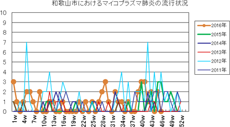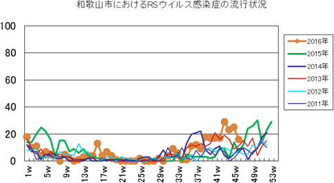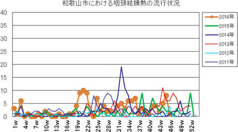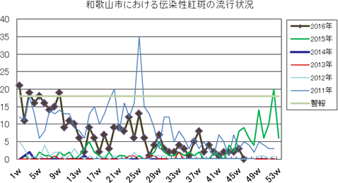 和歌山市の患者報告数は、2015年第1週1件、4週1件、11・12週1件、20週1件、25週1件、33週1件、40週3件、42週1件、43週2件、45・46週3件、47・48週1件、49週2件、50週1件、53週3件で、2016年第1週3件、2週1件、4週1件、5・6週2件、7週1件、8週2件、12・13週1件、16週1件、21・23週1件、25・27週1件、28週2件、29週3件、30週1件、32週2件、33・34週1件、36週1件、39週2件、40・41週3件、42週1件、43・45週2件の報告がありました。