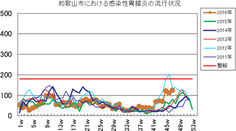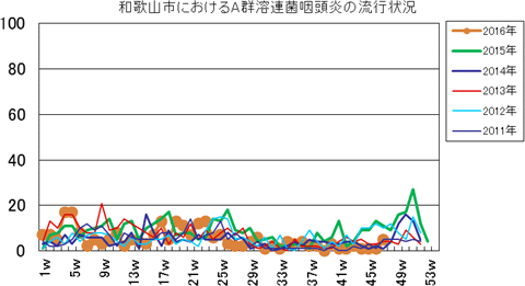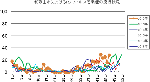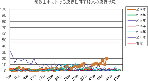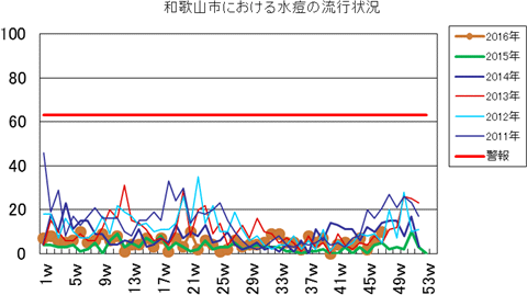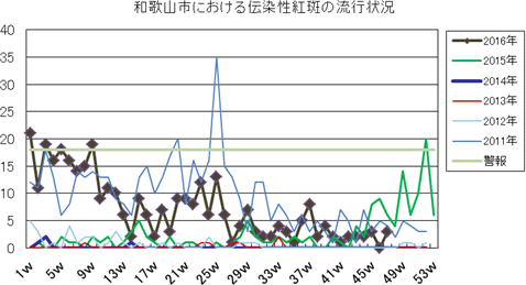 和歌山市の患者報告数は、2015年第1週1件、4週1件、11・12週1件、20週1件、25週1件、33週1件、40週3件、42週1件、43週2件、45・46週3件、47・48週1件、49週2件、50週1件、53週3件で、2016年第1週3件、2週1件、4週1件、5・6週2件、7週1件、8週2件、12・13週1件、16週1件、21・23週1件、25・27週1件、28週2件、29週3件、30週1件、32週2件、33・34週1件、36週1件、39週2件、40・41週3件、42週1件、43・45・47週2件の報告がありました。