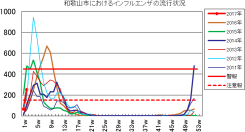 和歌山市内におけるインフルエンザの報告数は、2016年シーズンは、第44週2件、第45週6件、第46週9件、第47週16件、第48週26件、第49週47件、第50週55件、第51週54件、第52週64件、2017年第1週95件、第2週251件(定点あたり16.7)と注意報レベルに達しました。発生状況の詳細はこちらへ。