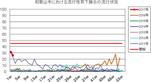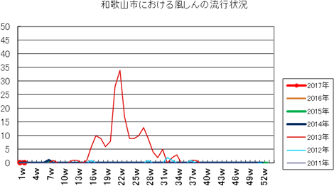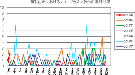 2016年第1週7件、2週8件、3週6件、4週5件、5週6件、6週10件、7週5件、8週6件、9週9件、10週6件、11週8件、12週1件、13・14週4件、15週7件、16週3件、17週7件、18週1件、19週7件、20週3件、21週10件、22週2件、23週6件、24週4件、25週1件、26週2件、27週6件、28週3件、29・30週4件、31週5件、32・33週9件、34週5件、35週5件、36週2件、37週8件、38週5件、39週7件、40週0件、41週4件、42週5件、43週4件、44週7件、45週2件、46週6件、47週10件、48週12件、49週14件、50週19件、51週15件、52週4件、2017年1・2週10件(定点あたり1.11)でした。