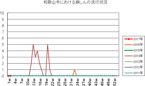 全国的に33週以降、麻しんの届出数が増加しています。和歌山市における発生状況は