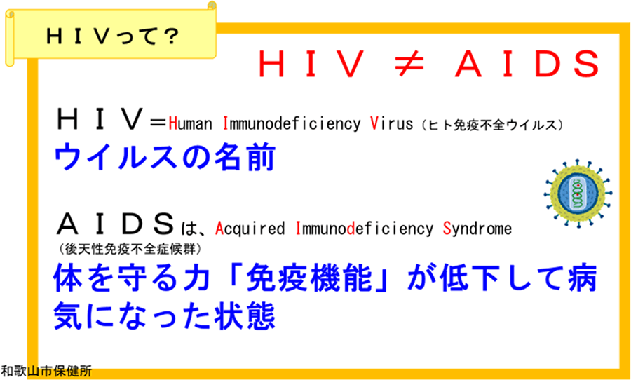 HIVは、ヒト免疫不全ウイルスというウイルスの名前。ヒトの免疫細胞に感染するウイルスです。