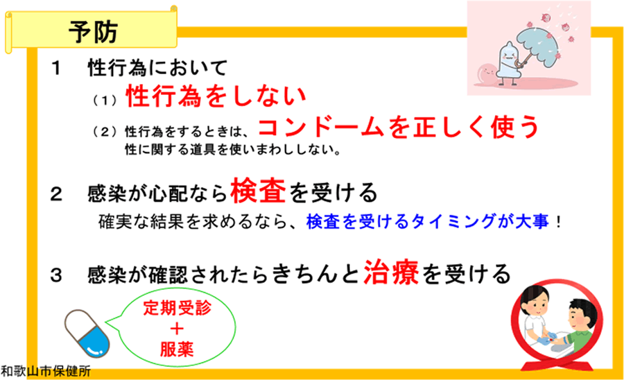 ワクチンはまだありませんが、HIVは感染力の弱いウイルスなので予防可能です。新規感染の80パーセント以上が性的接触によるものです。コンドームを正しく使うことが重要です。